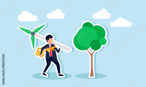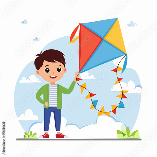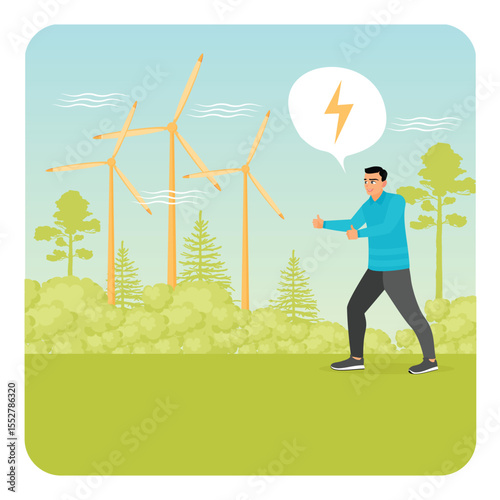 Stormy, windy and rainy weather concept vector illustration. Young man caught in heavy rain with thunderstorm and lightning, flat style design.