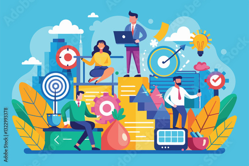 Vector illustration of big strategy dashboard and tiny people employees working toward common goals. Strategic project scheduling, planning and management concepts for web banner, website page etc.