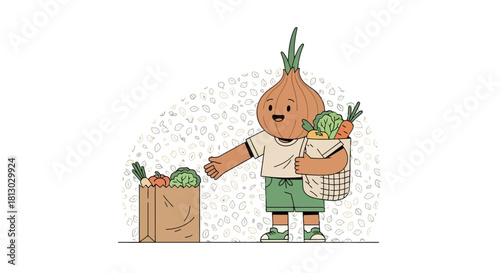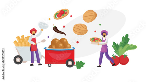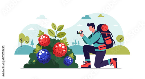 Young man pushing cart with ripe strawberries, vector flat illustration. Strawberry harvesting, transportation, fruit ice cream and other desserts production.