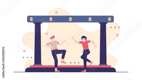 Cafe, restaurant, bakery, clothing store, spa salon, coffee shop facade with entrance door, glass showcases, striped awnings, flat vector illustration. Small street shop exterior with customers.