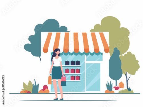 Street food shop vector poster template. Happy shopper male character with shopping cart full of food products in front of grocery store window, flat style design illustration.