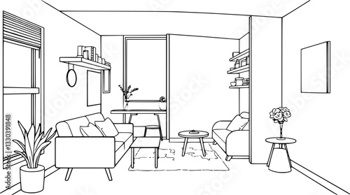 Studio apartment interior vector illustration in line art style. Sofa, coffee table, kitchen furniture, books and houseplants on shelves, picture on the wall. Cozy home interior design.