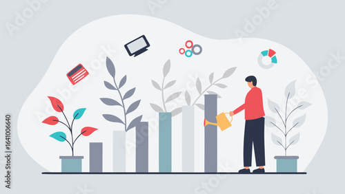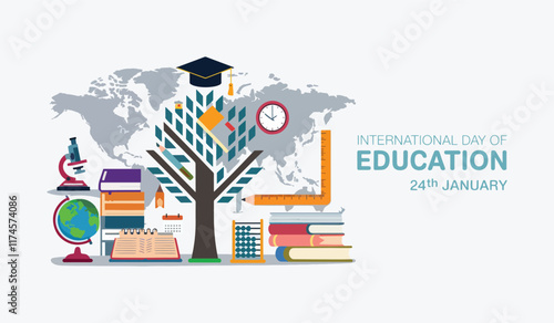 Study at the university, vector flat illustration. Huge planet Earth globe with graduation hat and micro characters students with book, pencil, calculator. Global study, education, knowledge.