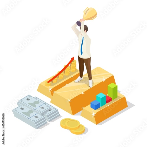 Successful businessman standing on gold ingot with trophy cup in raised hands, flat vector isometric illustration. Business success, financial growth concept.
