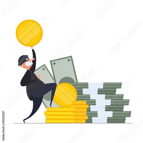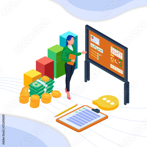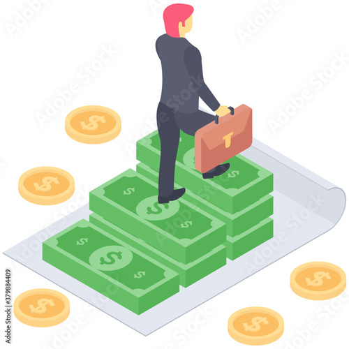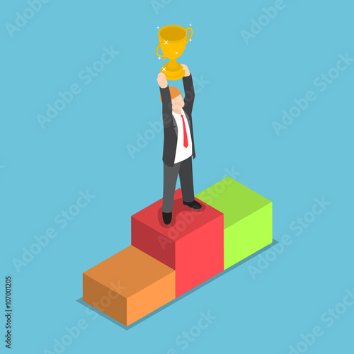 Successful businessman standing on gold ingot with trophy cup in raised hands, flat vector isometric illustration. Business success, financial growth concept.