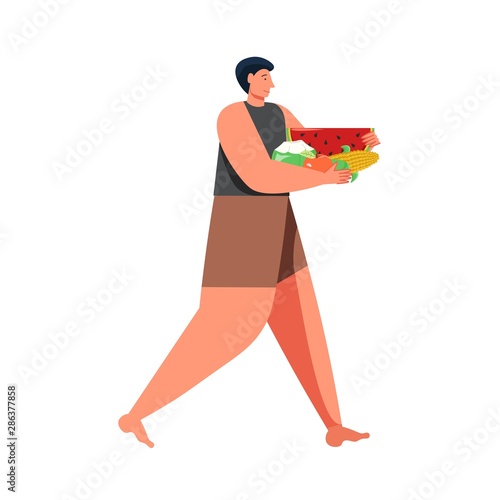 Man carrying summer fresh fruits and corn, vector flat illustration isolated on white background. Summer vacation, summertime, travel.