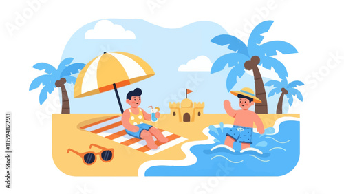 Summer beach vacation landing page design, website banner template set, flat vector illustration. Happy female characters taking rest at the seaside. Summer holiday, tropical vacation.