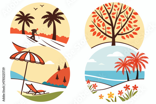 Summer beach vector paper cut illustration. Ocean beach with chaise lounge, tropical palm leaves and starfish in circle. Beach holidays concept for poster, banner, summer card.