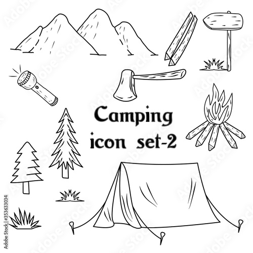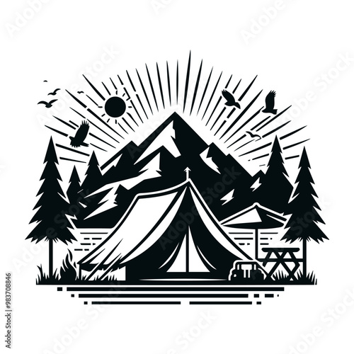 Summer camp in forest vector vintage label. Badge with travel tent, outdoor campfire and crossed axe isolated on white background