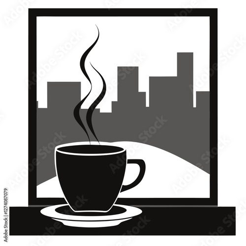 Summer camp vintage logo with steaming tea mug over mountain peak. Outdoor adventure in wild forest camp badge isolated on white background. Eco travel and tourism