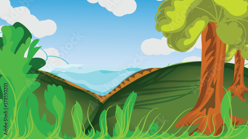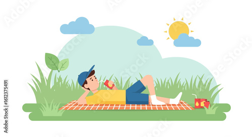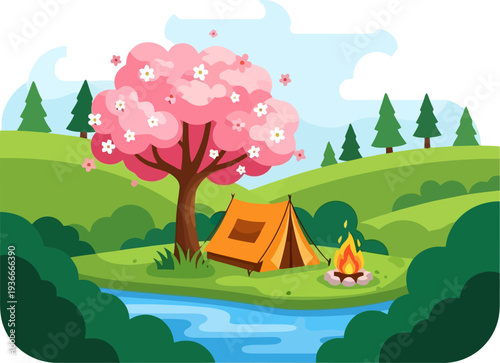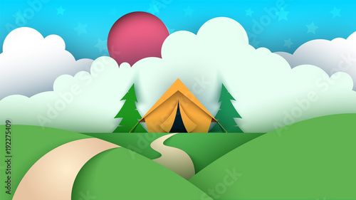 Summer camping in forest, vector illustration in paper art style. Tourist tent and campfire on forest glade. Hiking, trekking, summer vacation poster, banner template.