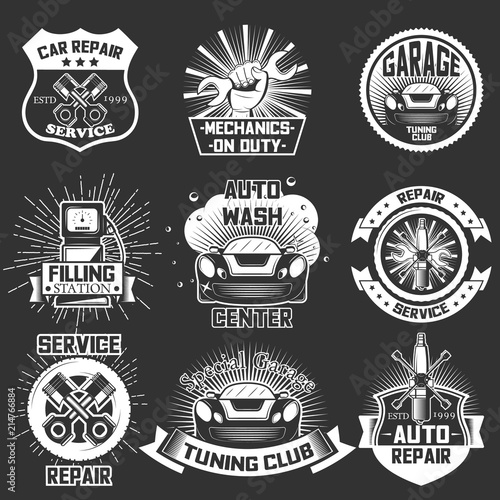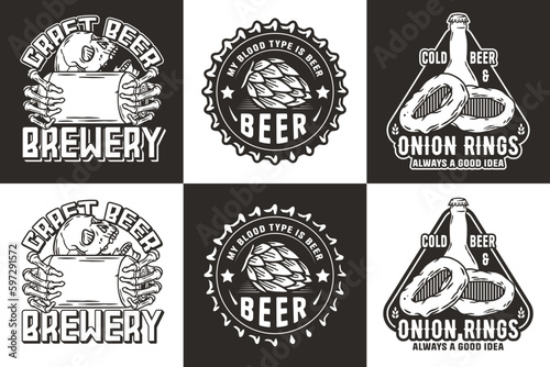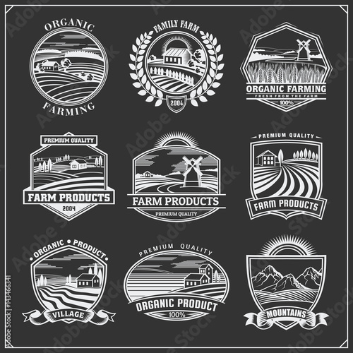 Summer camping label set, vector monochrome illustration. Vintage logos, badges, emblems with forest, tent, metal cup, axe, campfire, camper van and other camping symbols.