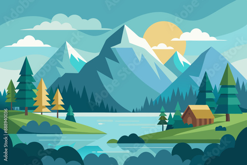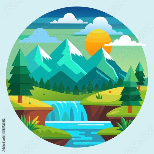 Summer camping background in circle with forest, mountains, lake, campfire and tent. Vector illustration in paper art style.