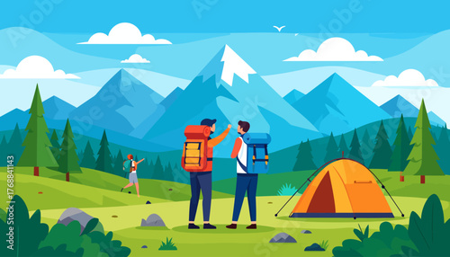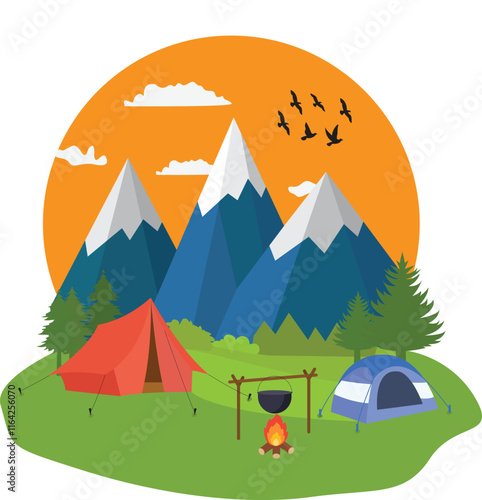 Summer hiking. Campsite with camping tents and happy women meditating, cooking meal on fire, drinking tea, flat vector illustration. Trekking, expedition, travel adventure, nature tourism, camping.