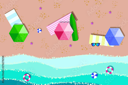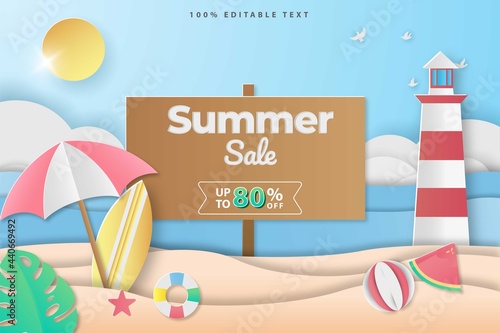 Summer sale concept vector banner. Tropical beach in paper art style. Top view paper cut illustration. Summer holiday vacation poster template. Craft origami.