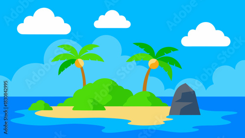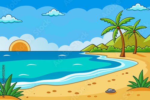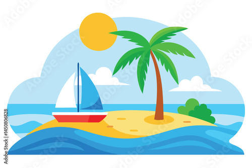 Summer sea beach vector. Travel paper cut art poster. Tropical holiday vacation background. Origami island with palm tree, ocean water wave and sky. Adventure and tourism
