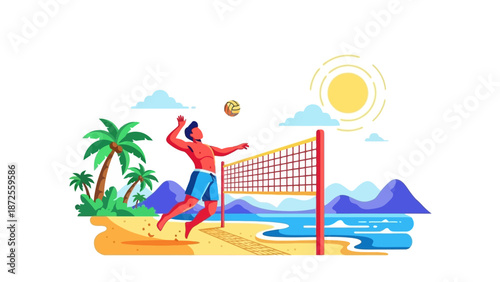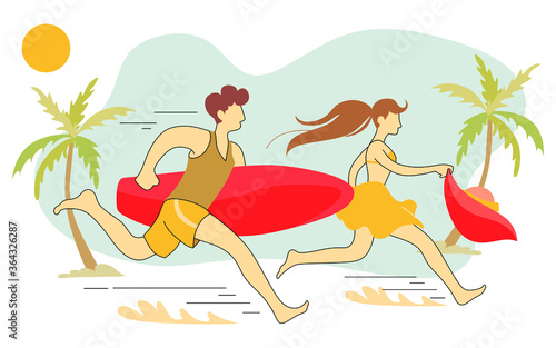 Girls sunbathing on chaise lounge, drinking cocktail, man running with surfboard, vector flat style design illustration. Summer beach vacation, traveling, surfing, water beach activities concept.
