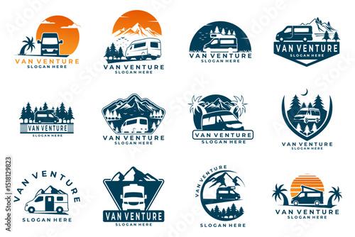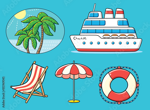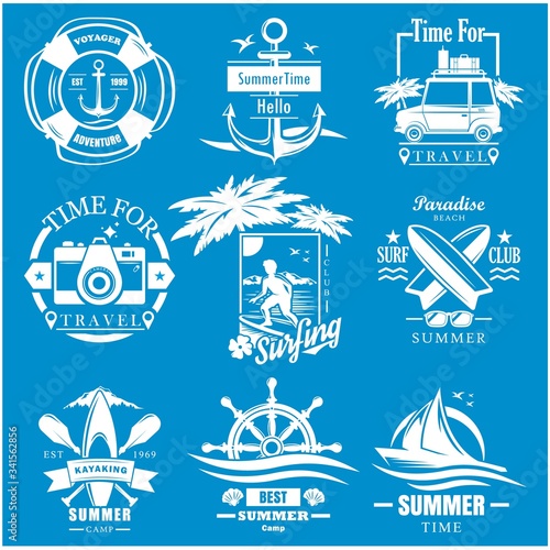 Summer time travel vintage logo, label, badge set, vector illustration. Surfing, kayaking summer camp, sea cruise, yacht trip, voyager adventure white emblems on blue background.