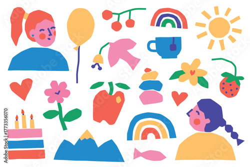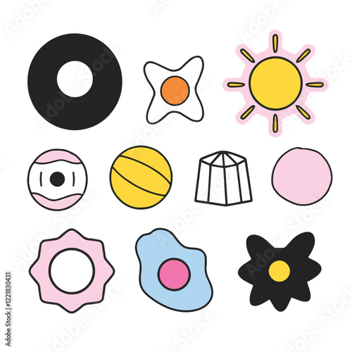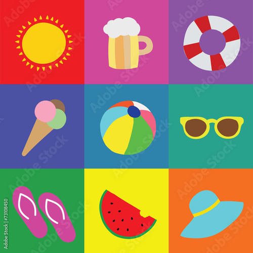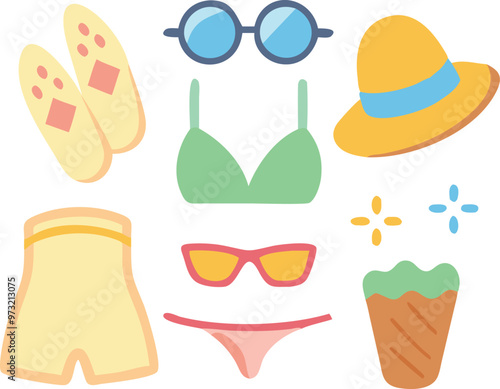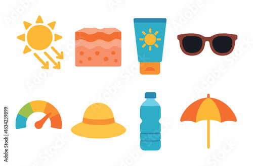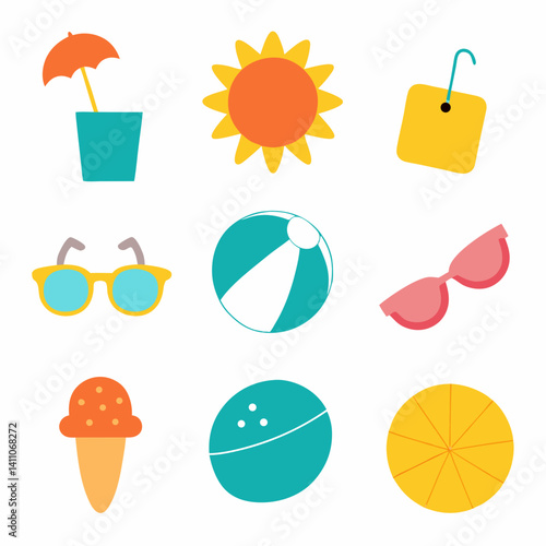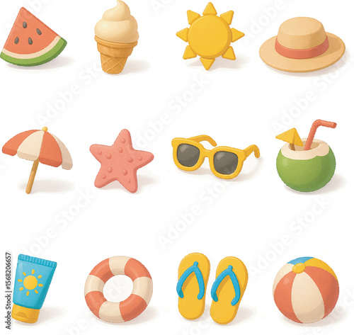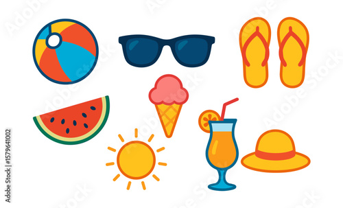 Summer icon isolated vector set. Sunscreen, sunglasses, inflatable ball, ice-cream, slippers, sun, luggage bag, watermelon slice, diving snorkeling mask holiday vacation item illustration
