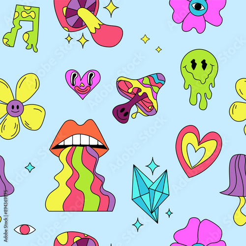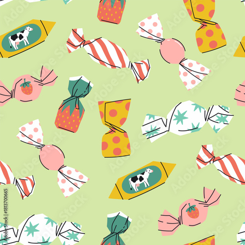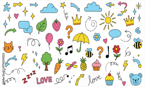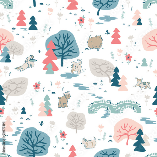 Summer seamless pattern. Vector hand drawn animals bunny, squirrel and fruits pineapple and slice of watermelon.