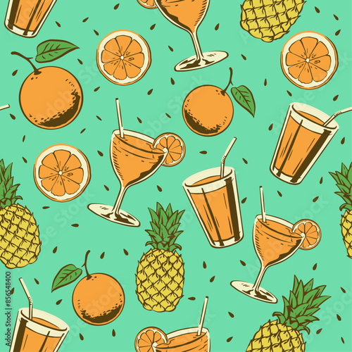 Summer seamless pattern. Vector hand drawn ice cream cones, coconut milk, pineapples and slices of watermelon.