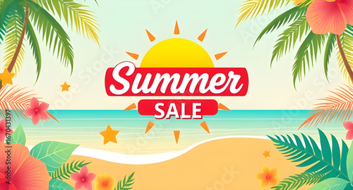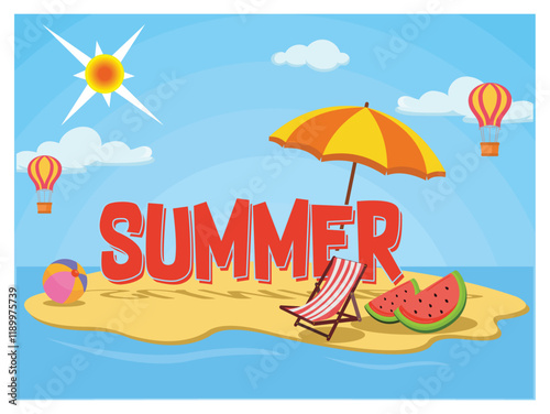 Summertime vector paper cut illustration. Tropical landscape with ocean waves, sand, palm leaves, beach umbrella, flip-flops, sunglasses, starfish. Beach holidays poster, banner summer card template.
