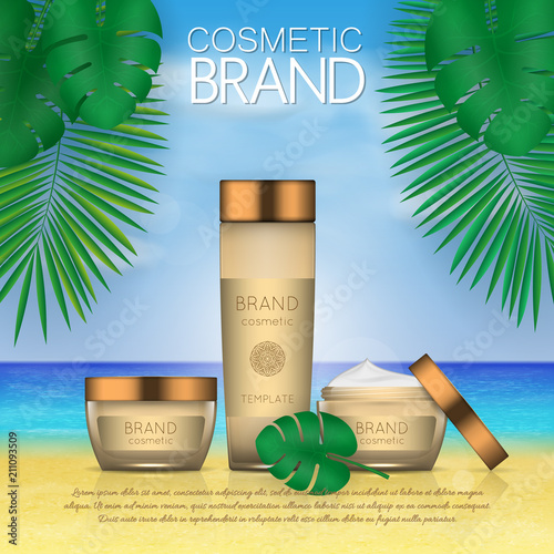 Sunscreen packaging tube on round display podium, paper cut exotic leaves, vector illustration. Tropical floral background for sunburn protection cream. Summer beauty and cosmetic product ads template