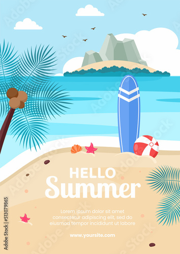 Sunscreen packaging tubes, paper cut exotic beach background, parasol, flip flops, glasses in round frame, vector illustration. Sunburn protection cream, summer beauty cosmetic product ads template.