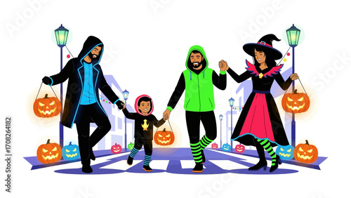 Superhero family, flat vector illustration. Happy smiling mom, dad, cute children and pet dog wearing cape, masks, superhero costumes, cityscape background.