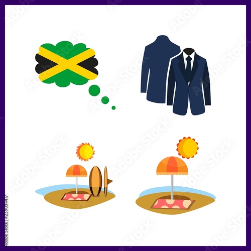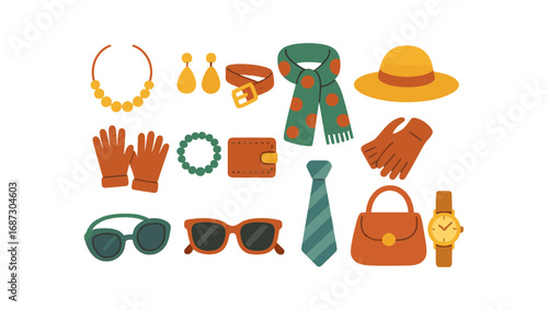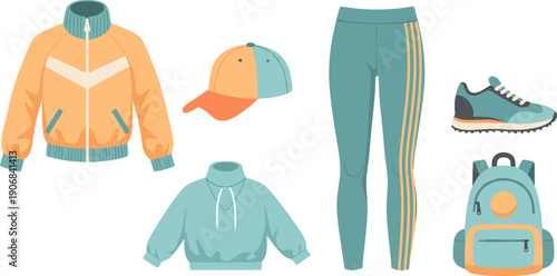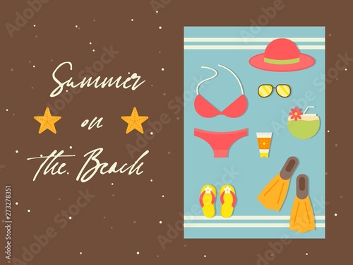 Surfing vector flat style design illustration. Surfboard, wetsuits, mask, sunglasses, sunscreen, coconut cocktail and ocean wave. Surfing equipment and gear composition for web banner, webpage etc.