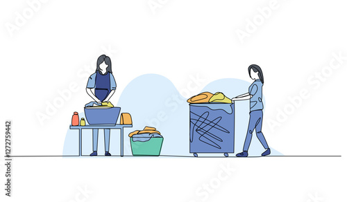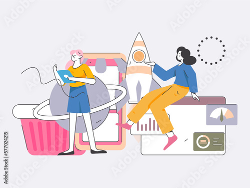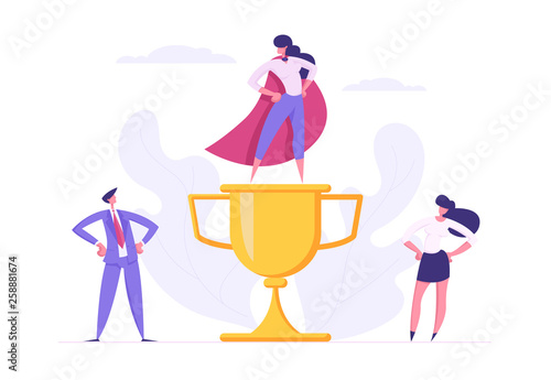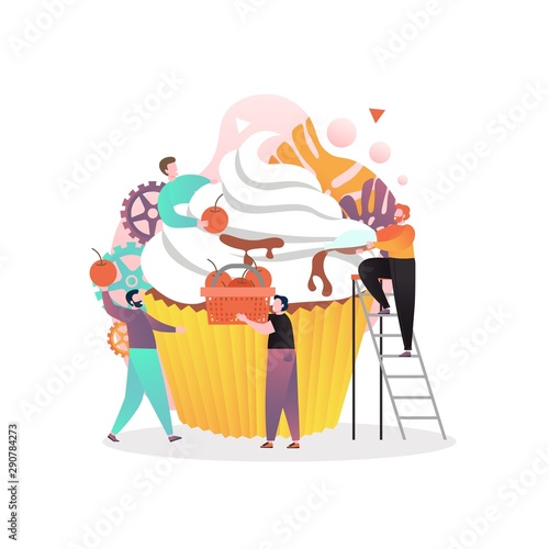 Tiny happy people making big tasty cherry cupcake, vector illustration. sweets production, confectionery, pastry composition for web banner, website page etc.