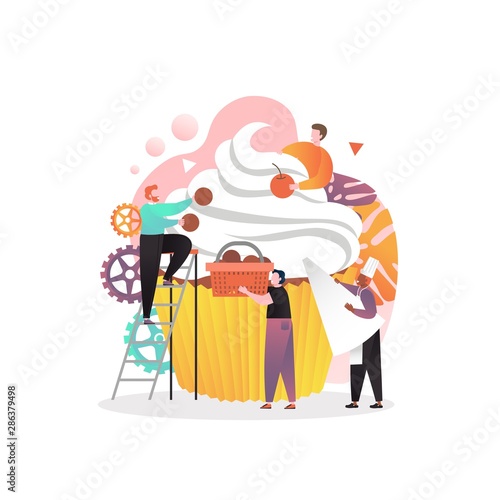 Tiny people decorating huge cupcake with cream and cherry, vector illustration. Sweet pastry, confectionery, bakery concept for web banner, website page etc.