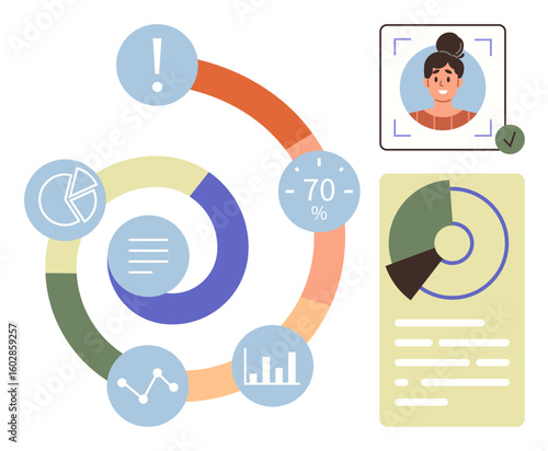 Tablet with charts and idea lamp on screen, flat vector illustration. Business idea, innovation.