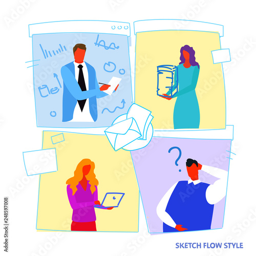 Tailor master taking measurement and fitting of pretty bride for beautiful wedding dress vector illustration. Professional atelier studio interior background