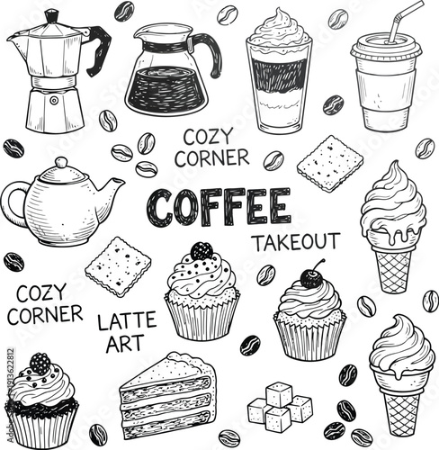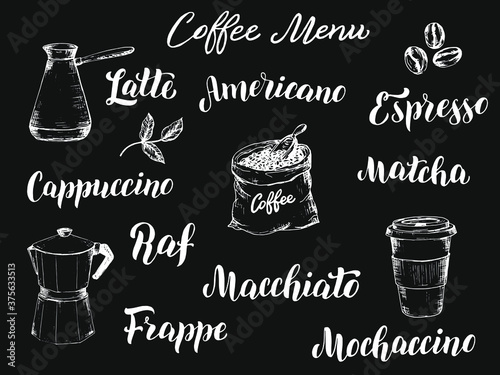 Vector realistic disposable coffee cup with doodle sweets, coffee drinks, business symbols, coffee quotes on chalkboard background. Sketch vintage take away coffee poster, banner template.