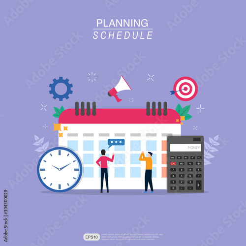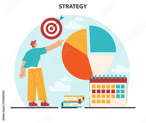 Target, calendar, to do list with check marks and businessman showing ok hand sign, flat vector illustration. Time management, planning, scheduling.