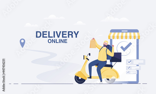 Huge laptop computer internet store and male and female characters doing tax free shopping online, vector illustration. VAT refund concept for web banner, website page etc.
