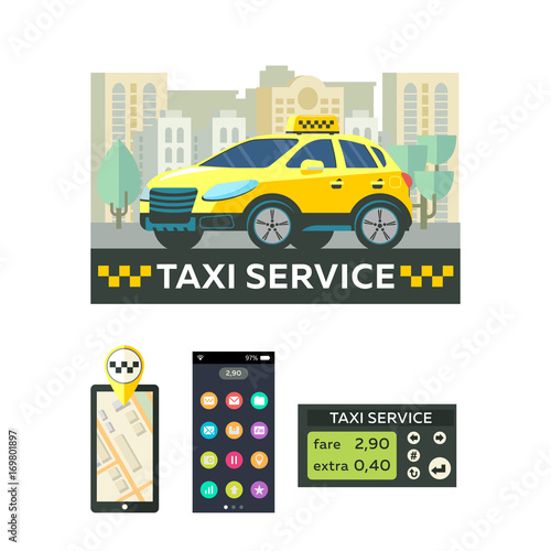 Taxi online, flat vector isometric illustration. Smartphone with city map, location pin and yellow car. Mobile taxi service app.