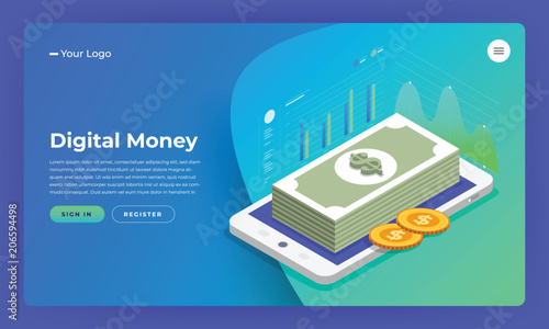 Applications for taxi services banner, web template. Vector isometric smartphone with cityscape, yellow taxi cab and map marker on screen, copy space, read more button.