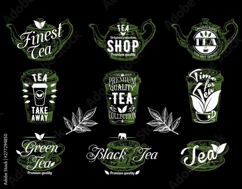 Tea emblem, logo, badge and label set, vector hand drawn illustration in retro style. Tea house shop cafe vintage hand lettering typography.