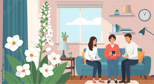 Team of tailor master taking measure of pretty bride for elegant wedding dress vector illustration. Process of sewing traditional garment for marriage in professional workshop atelier studio