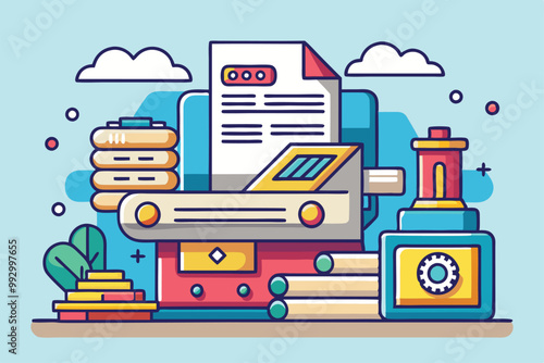 Business people team micro male and female characters working on huge laptop, shouting through megaphone, looking through telescope, vector flat illustration. Team work business concept.