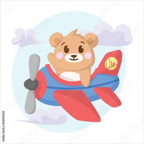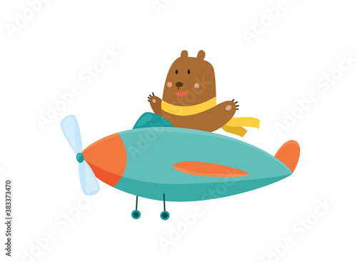 Teddy bear cute pilot animal cartoon vector icon. Funny character flying on aeroplane isolated on white background. Doodle design for postcard