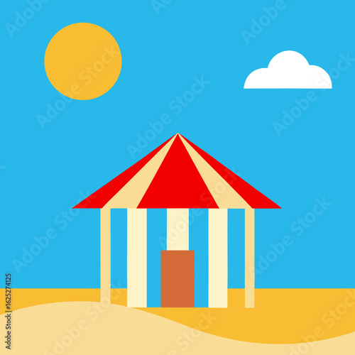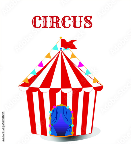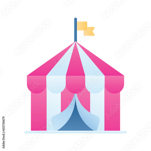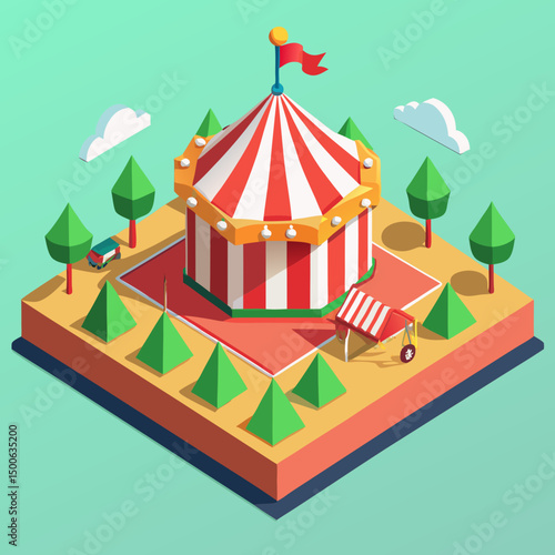Tent for circus carnival event, party and park funfair vector. Fair or cirque striped marquee with flag on top and balloons isometric illustration isolated on white background
