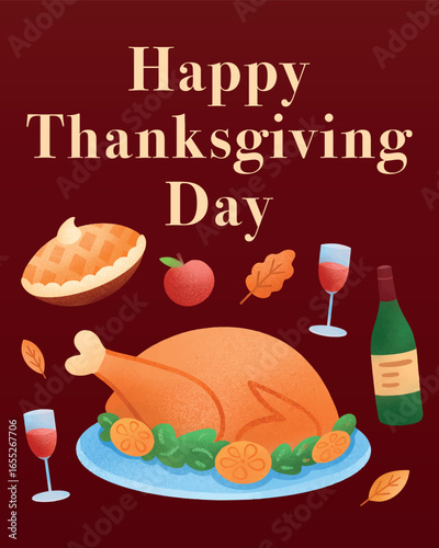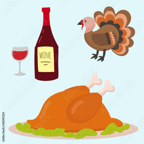 Thanksgiving Day vector flat illustration. Traditional roasted turkey, wine, maple leaves, acorns, cornucopia with pumpkin, corn cobs, apple. Happy Thanksgiving Day concept for web banner website page