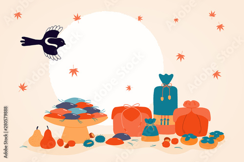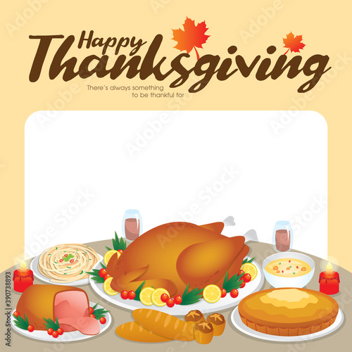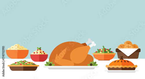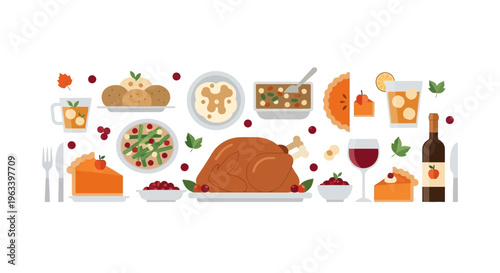 Thanksgiving Day vector flat illustration. Traditional roasted turkey, red wine, acorns, pumpkin, candles and calendar. Happy Thanksgiving Day celebration concept for web banner, website page etc.