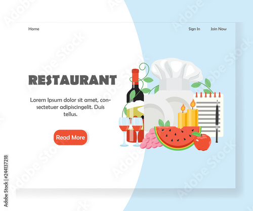 Thanksgiving Day landing page template. Vector flat style design concept for website, mobile site development. Roasted turkey, wine, maple leaves, acorns, cornucopia with pumpkin, corn cobs, apple.