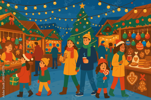 Theatrical performance. Group of actors performing on stage for audience, flat vector illustration. Theater interior with red curtains, spotlights. Comedy or drama. Entertainment. Theatre arts.