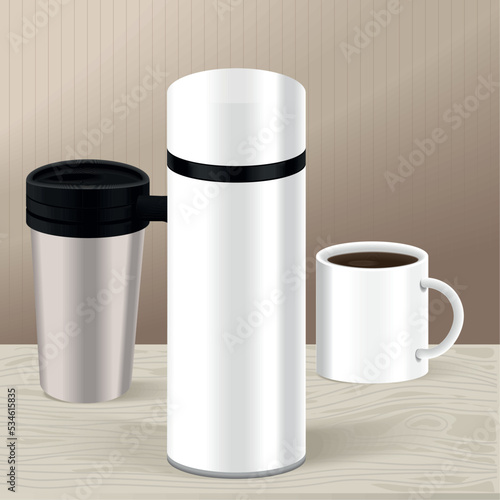 Thermo cup travel mug mock-up set. Vector realistic illustration isolated on white background.