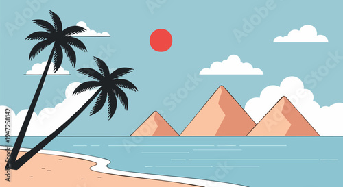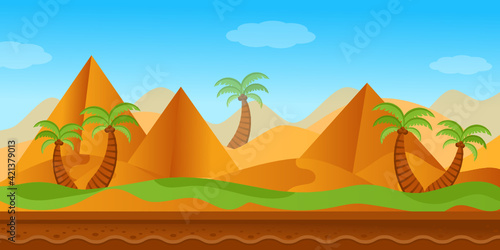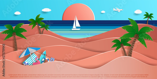 Three camels roaming desert, vector illustration in paper art style. Sand dunes, desert landscape.
